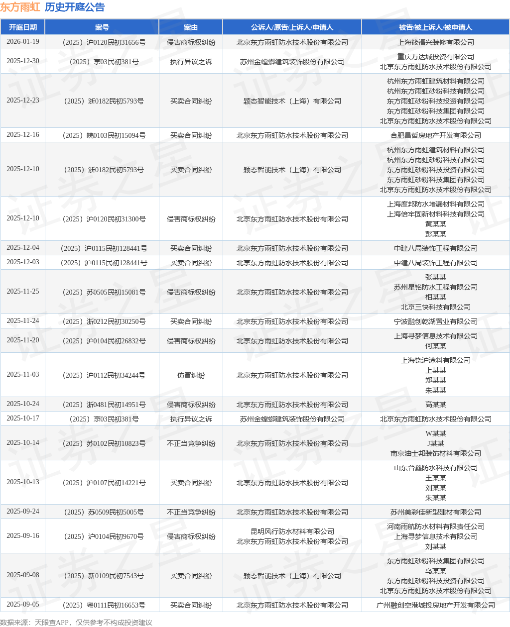依据计算,近一年内以北京东方雨虹防水技能股份有限公司为当事人的前史开庭公告有84则,其间案由为“生意合同胶葛”的公告以31则居首,其次为“损害商标权胶葛”有17则,“不正当竞争胶葛”有7则。前史开庭公告(前20条)如下: